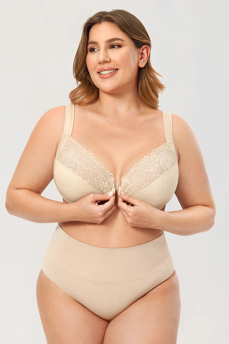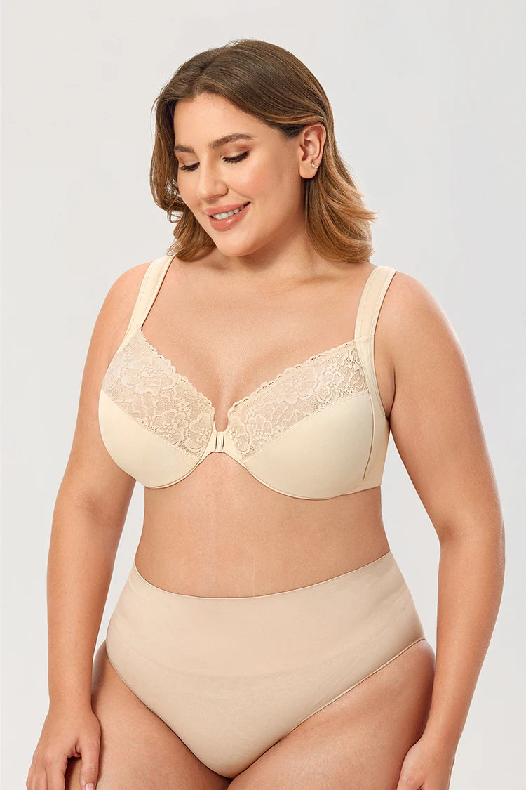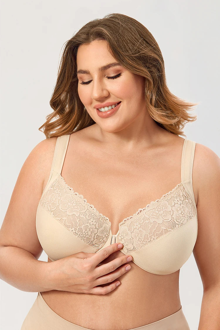 Front closure bras are much easier to put on and off. With underwire and cushioned padded comfortable straps to relieve shoulder pressure and perfect adjustment to your fit. This bra will be your everday go to bra. With lace to offer side support and control for our full figures.