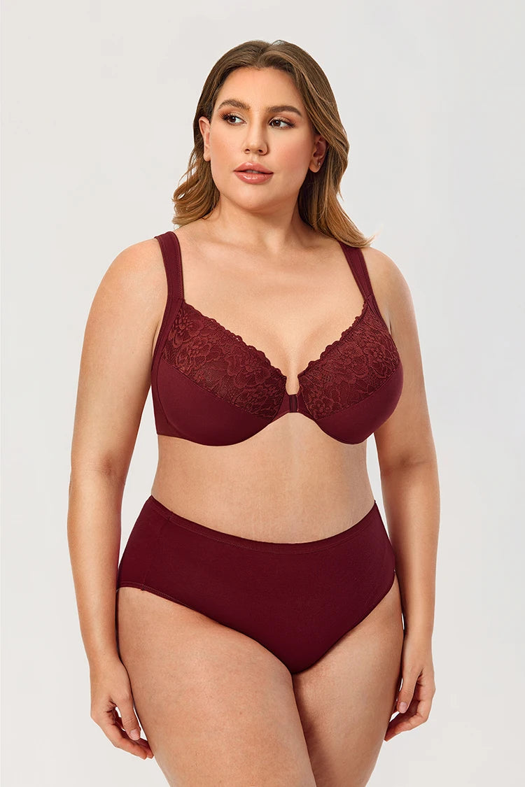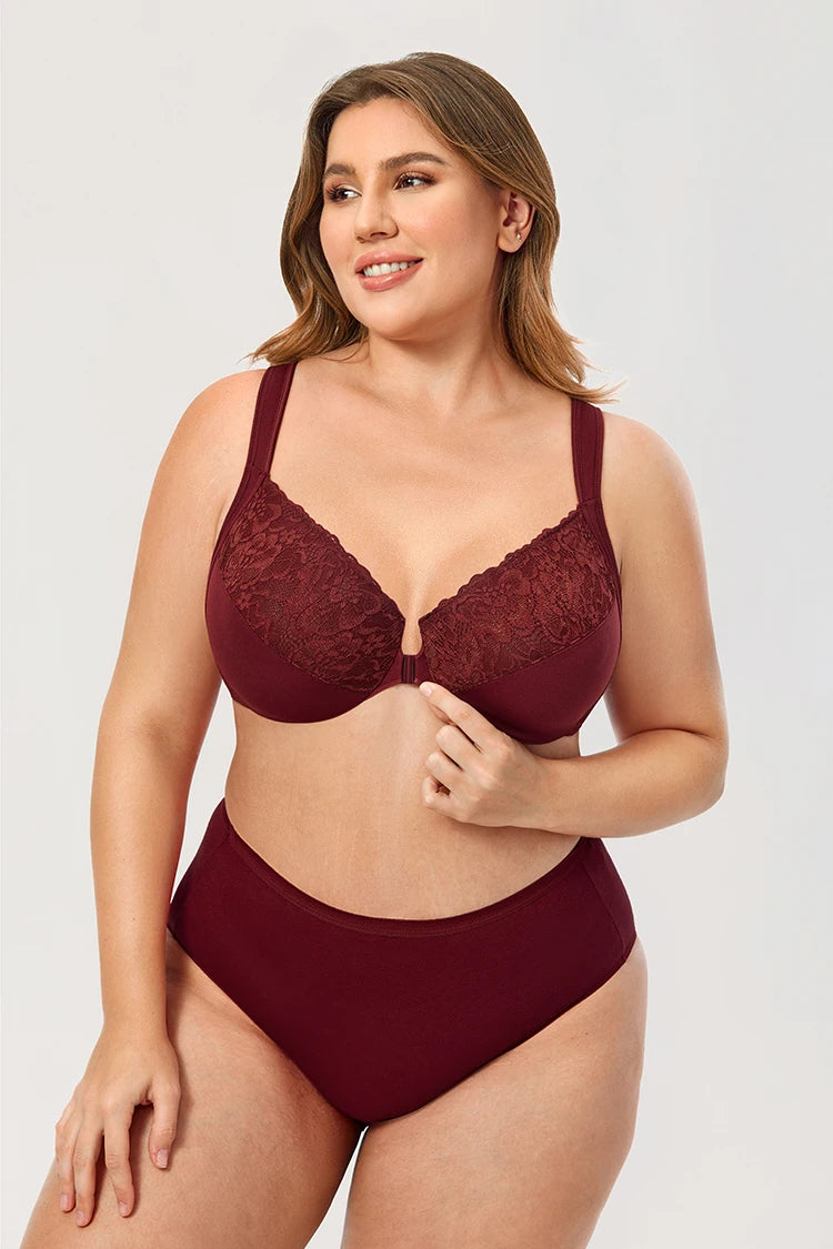 Front closure bras are much easier to put on and off. With underwire and cushioned padded comfortable straps to relieve shoulder pressure and perfect adjustment to your fit. This bra will be your everday go to bra. With lace to offer side support and control for our full figures.